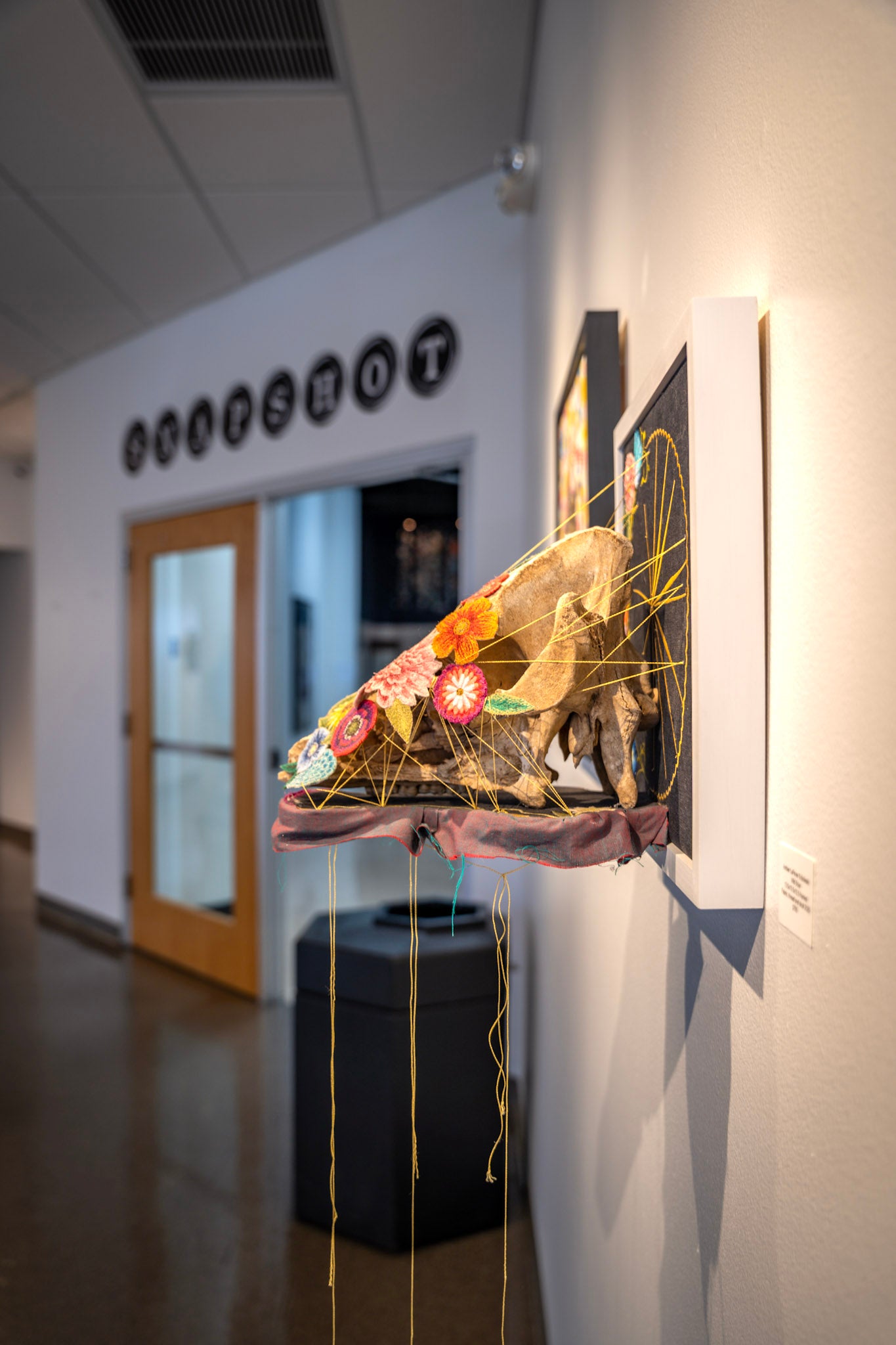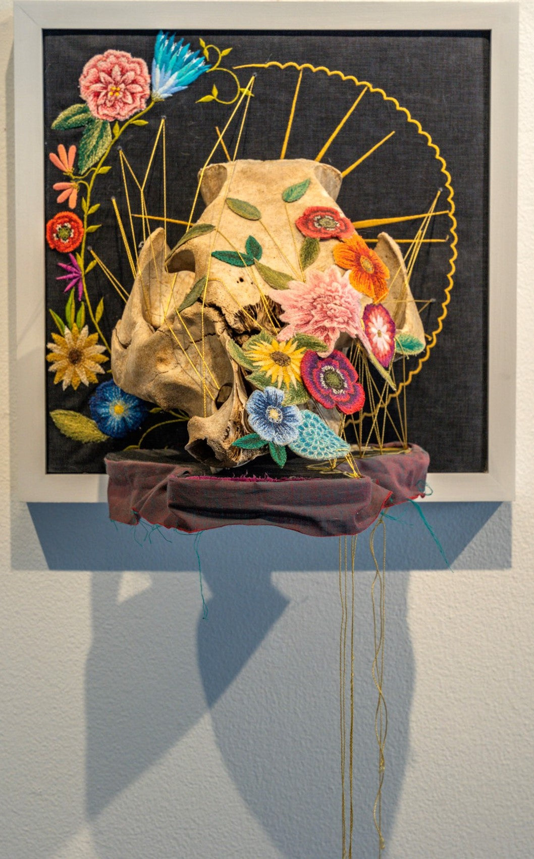 13.5x13.5x12.5 inches framed, Fabric, thread, and skull, $700